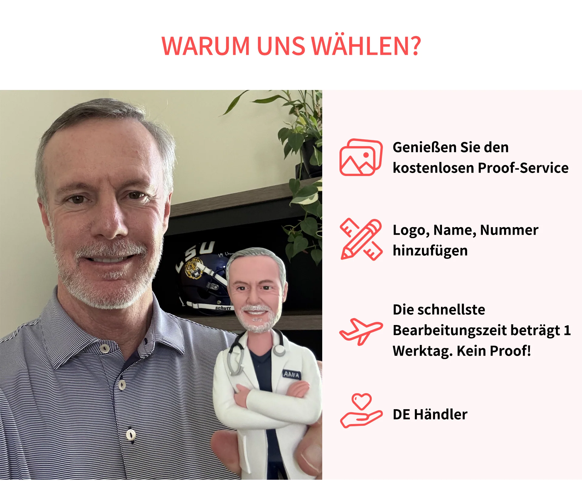 Die Designvorschau ist eine Interaktion zwischen dem Kunden und unserem Künstler. Vor dem Versand muss der Kunde das individuelle Wackelkopf-Design genehmigen. Diese Kommunikation erfolgt bei den meisten Bestellungen kurz nach dem Kauf per E-Mail