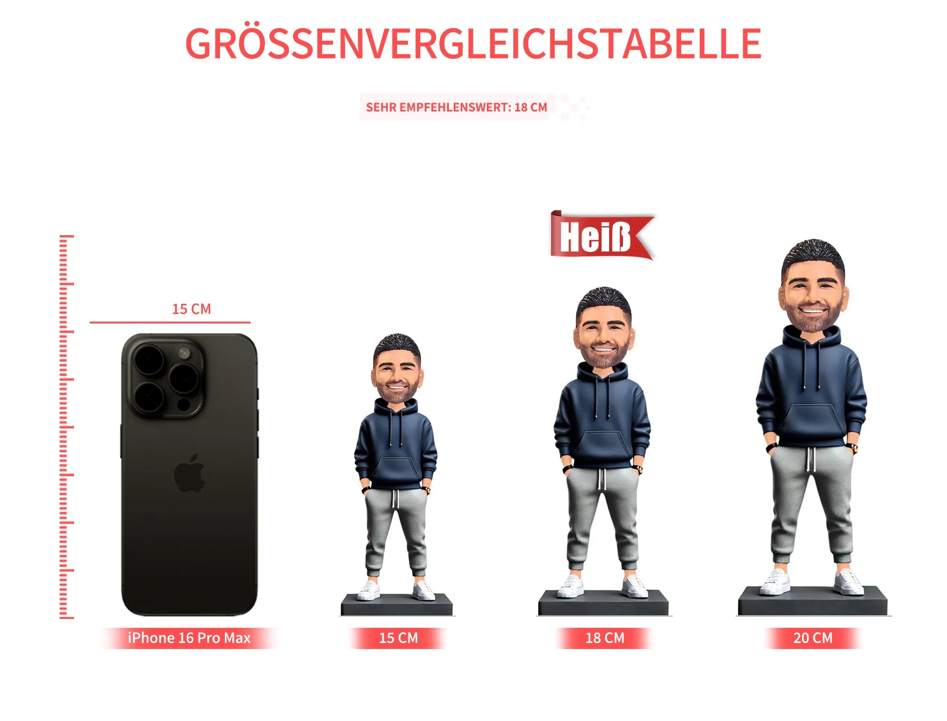 Unsere Standard-Wackelköpfe sind etwa 15–26 cm groß und eignen sich daher perfekt zur Präsentation auf Schreibtischen, in Bücherregalen oder als Dekoration im Auto.